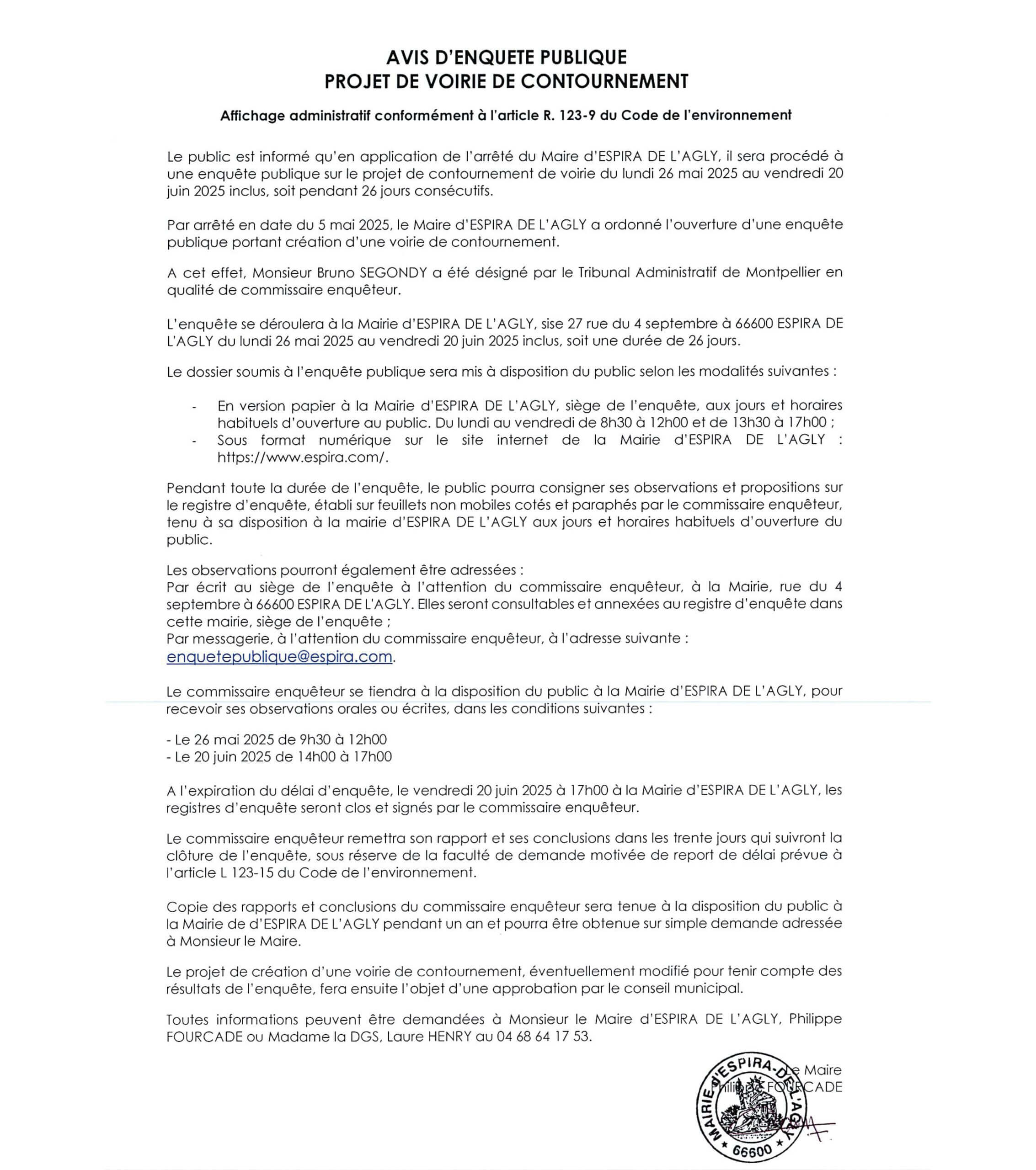 Dans le cadre du projet de création d’une voie de contournement, une enquête publique sollicitée par Monsieur le Maire d’Espira de l’Agly, sera ouverte du lundi 26 mai au vendredi 20 juin 2025 (arrêté municipal du 5 mai 2025).
