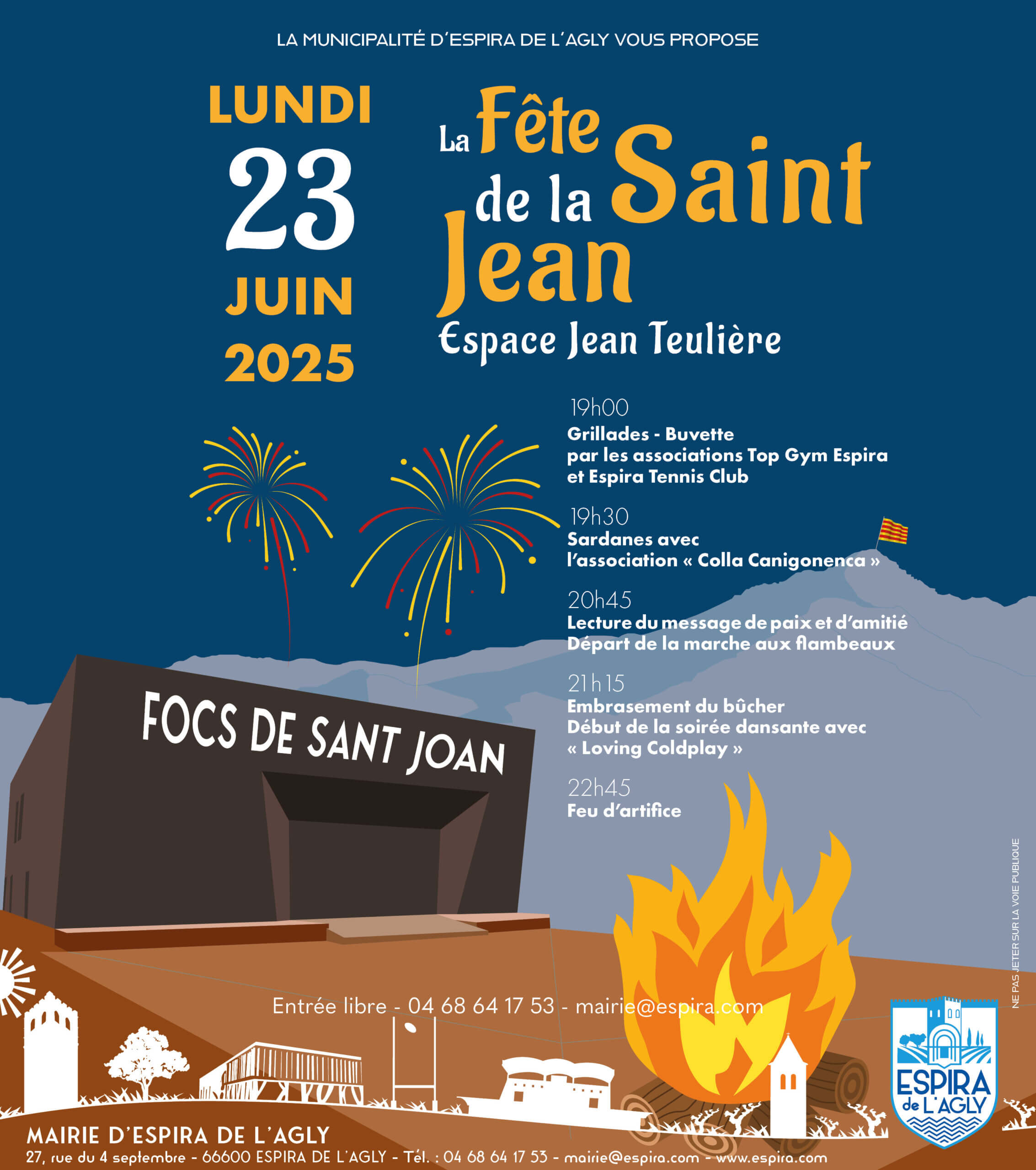 Au programme : musique et danses traditionnelles (sardane), allumage du feu avec la flamme du Canigou, grillades et buvette, marche aux flambeaux, concert et un grand spectacle pyrotechnique pour clôturer la soirée.