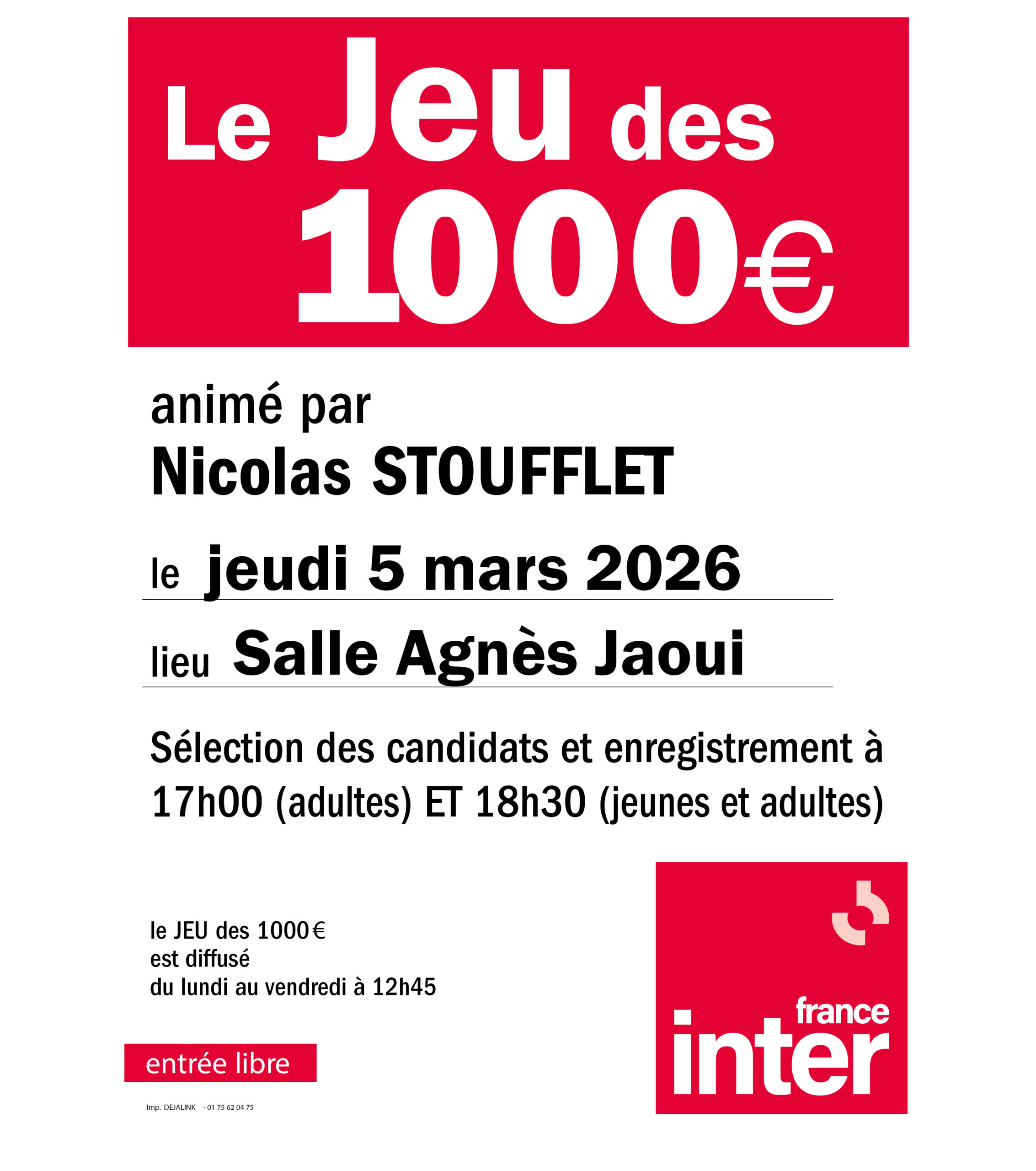 Créé en 1958, le JEU des 1000€ est le plus ancien jeu radiophonique français et rassemble chaque jour 1.5 million d’auditeurs autour de questions de culture générale, dans une ambiance conviviale et chaleureuse.