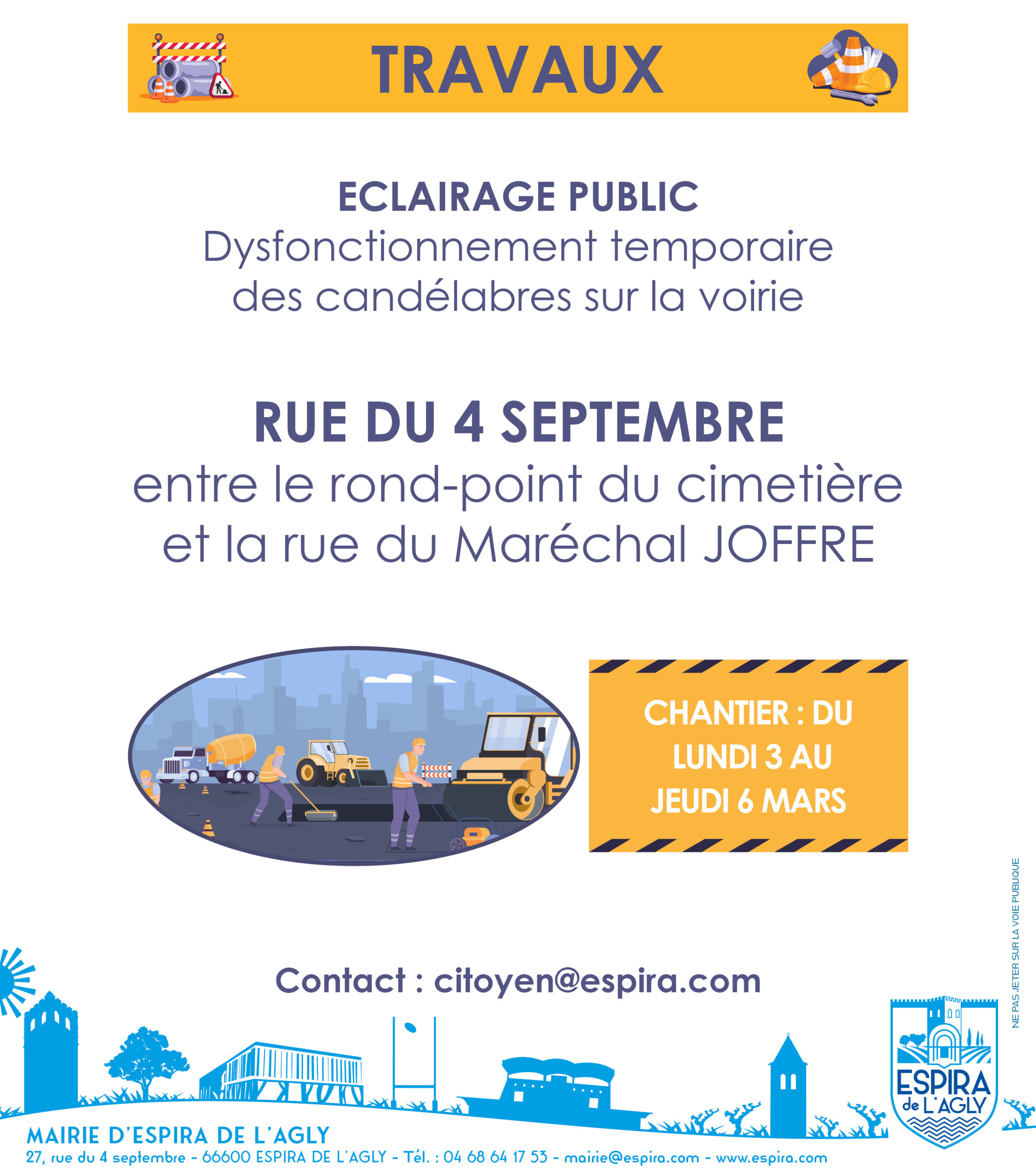 La mairie vous informe qu’un dysfonctionnement temporaire des candélabres sur la voirie de la rue du 4 septembre (entre le rond-point du cimetière et la rue du Maréchal Joffre) aura lieu dans le cadre de travaux d’entretien de l’éclairage public.