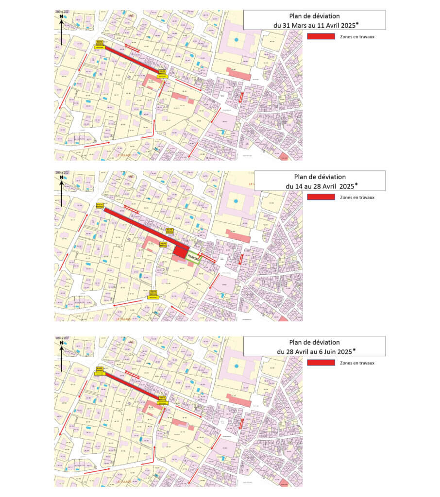 Des travaux de réfection et aménagement de voirie sont programmés pour les rues André VERGÈS à partir du 31 mars jusqu’au 6 juin 2025. Les plans montrent les impacts sur la circulation et le stationnement dans le secteur en fonction de la tranche de travaux.