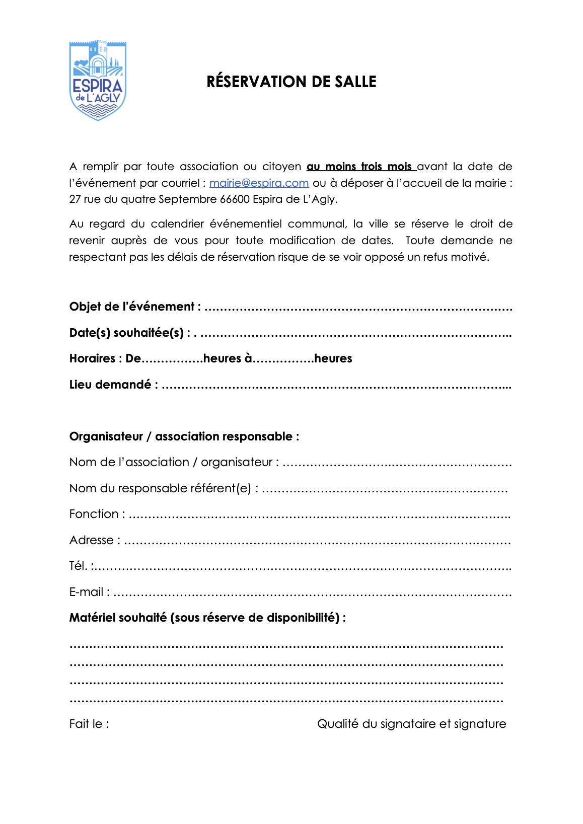 ** Sauf gratuité pour Associations d’Espira de l’Agly et Institutions Publiques.